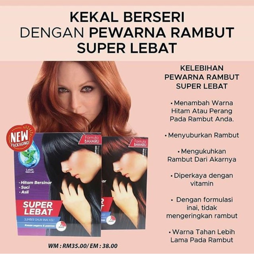 Dherbs Pewarna Rambut Super Lebat. Dirumuskan khas daripada 100 herba yang diperkaya. PEWARNA RAMBUT Super Lebar Perang Dherbs HARGA PROMOSI SEKARANG RM2990 MOHON TAMBAH RM 700 UNTUK POSTAGE SEMENANJUNG.